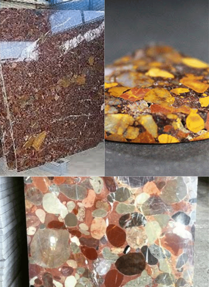 سنگ های مرمریت کنگلومرا به سنگ هایی هستند که از به هم چسبیدن ذرات ریزودرشت سنگ به وجود می آیند و عموماً این سنگ ها به رنگ قرمز یا ترکیبی از رنگ قرمز در طبیعت یافت می شوند. تفاوت سنگ های کنگلومرا در میزان پُررنگی و کمرنگی رنگ قرمز و درشتی و ریزی سنگ های تشکیل دهنده آن ها است.