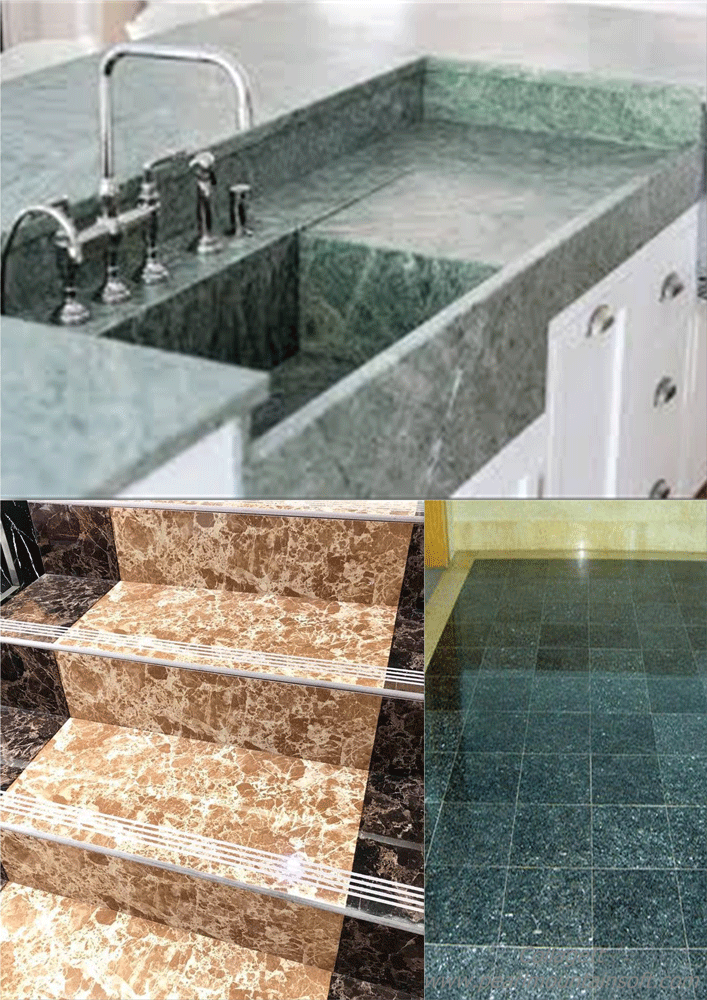 سنگ های مرمر صیقل پذیری بالایی دارند و به دلیل جلای بالا و رنگ های زیبا مناسب برای دکوراسیون داخلی، کف پوش، ستون ها، پله ها و تزئینات داخل ساختمان می باشند.